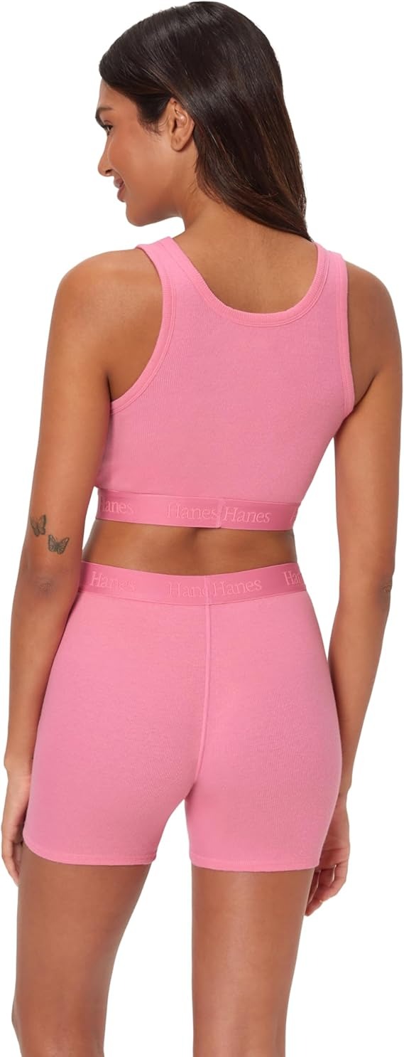 Crop top features ribbed fabrication paired with a soft and stretchy band under the bust, while the boxer shorts offer a tonal Hanes soft-stretch elastic waistband - allowing you to move with ease