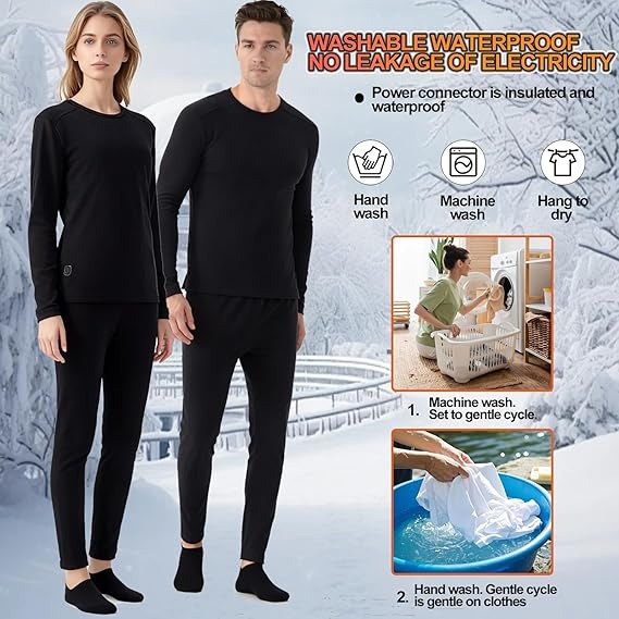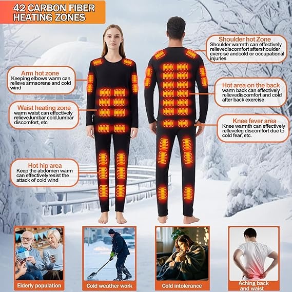 men Women Electric Heated thermal underwear with 42 carbon fiber heating elements, Shoulder, Back, Waist, Elbow, Axillary, Abdomen, Knee, Buttock, Legs, wider heating area, balanced heating. Heated underwear set help to improve blood circulation,enhance metabolism, reduce muscle stiffness etc. activating blood and keeping warm for your body.