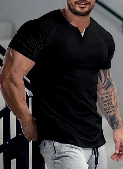 Men's henley shirt, Henley style, solid color, V-neck, short sleeves, slim longline cut, simple and fashionable. The unique front contrasting V-neck design, making it stand out from other basic T-shirts, becomes a must-have fashion item for your wardrobe