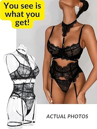 This 4 piece lingerie set features with exotic choker, underwire bra, high waisted belt, g string panty and garter leg straps to show your curve beautifully