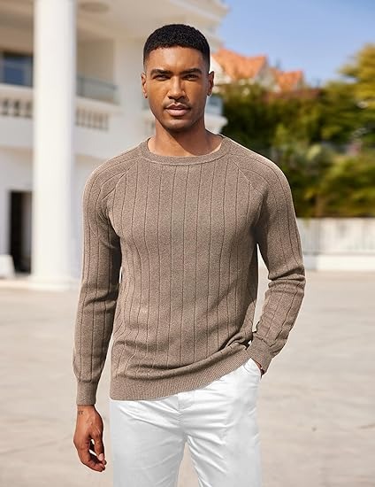 This crewneck knit sweater is available in wide and narrow ribs. The wide rib width is 2.5 cm, and the narrow rib is 1.0 cm. This mens lightweight sweater is a must-have in men's wardrobe in spring, summer, fall, winter, providing warmth during mild weather and serving as a lightweight option for colder months.