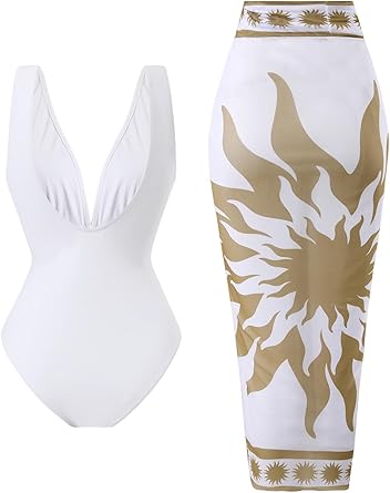 Sexy v neck swimsuit for women features ruched details front design, offers great slimming silhouette. Swimsuit with long cover up beach skirt with retro floral patterns, make you looks stylish.