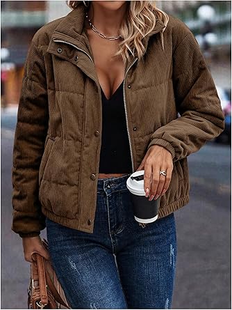 Button, zipper, pocket, stand collar, long sleeve, drop shoulder, single breasted, puffer jacket, jacket women, fashionable